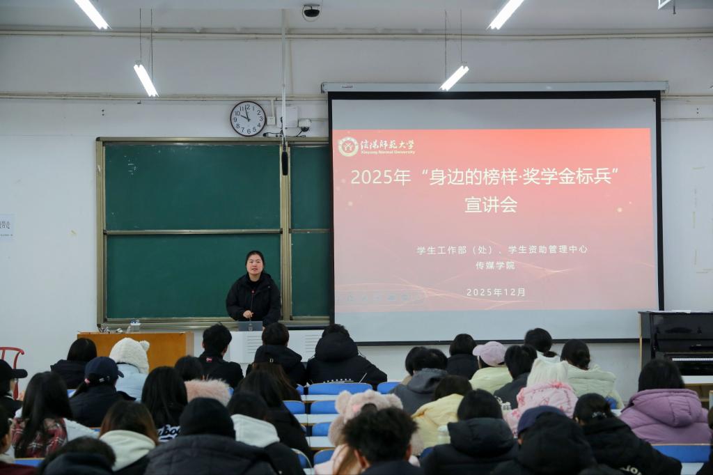 为充分发挥我校奖学金获得者的示范引领作用,激励广大学子砥砺奋进,营造良好的校风学风,12月18日,韦德(中国)体育在社科楼327教室开展了2025年“身边的榜样·奖学金标兵”宣讲活动。我院2024级和2025级学生参与,活动由辅导员张心悦主持。