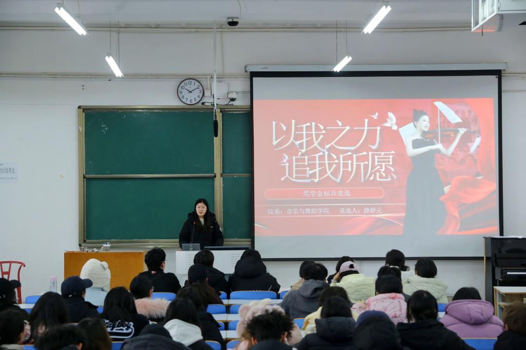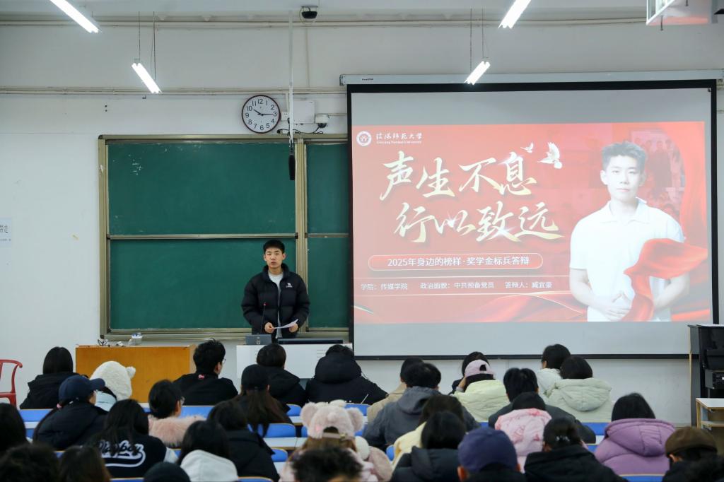 活动前,张心悦首先介绍了我校“奖学金标兵”评选工作的流程和原则,鼓励同学们积极投身学科竞赛、社会实践与各类校园活动中,以先进典型为榜样,找准成长方向,在逐梦征程中坚定信念、勇毅前行。随后,三名本年度“奖学金标兵”获得者依次宣讲。