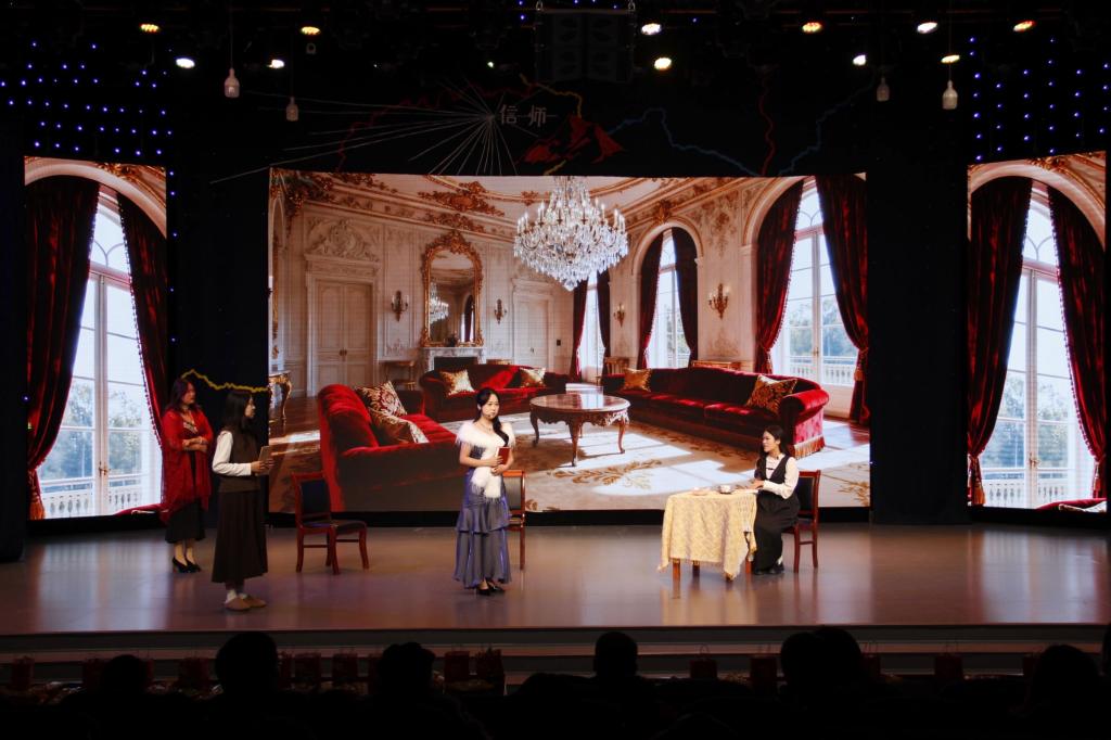 晚会以一段活力四射的舞蹈开场,瞬间点燃现场气氛。经典剧目《日出》片段率先登场,演员以细腻演技刻画人物在压抑中对光明的坚守,引人深思。校园题材小品《难忘的运动会》生动再现运动场上的热血与欢笑,轻松诙谐,反响热烈。经典剧目《茜茜公主》则带来浪漫氛围,呈现对自由与真爱的追求。研究生王一帆演绎黄梅戏《女驸马》选段,唱腔婉转,展现传统戏曲韵味。《萨德侯爵夫人》聚焦欲望与道德的博弈,叩问人性边界。朗诵《从南门到北门》串联校园四季风景,唤起师生的共同记忆;红色主题朗诵《一盏灯,一种信念》致敬革命先辈,传承红色精神。最后,马豫同学以一曲《映山红》为晚会画上圆满句号。