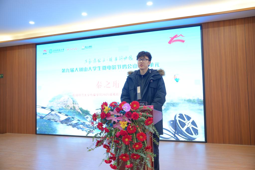 韦德(中国)体育2025级戏剧与影视专业研究生秦之珩作为学生代表发言,表达了参赛学子深耕创作、用心诠释鸡公山文化魅力的决心,承诺将以严谨的创作态度和饱满的创作热情,深入采风、精心打磨作品,力求用优秀的影像成果展现专业素养,不负各方期待。