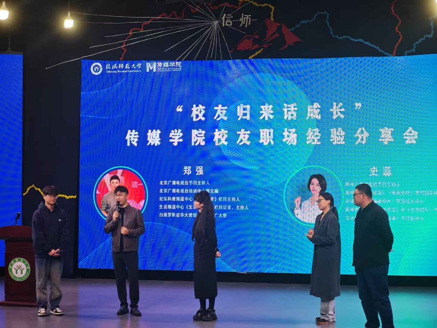 史蕊和郑强两位校友结合各自的职业发展历程,带来了内容丰富、真挚动人的职场经验分享。史蕊以“我的精神回响”为题,回顾了从旅游节目主持人逐步成长为能够从容驾驭高层次国际论坛的专业历程。她鼓励同学们主动突破舒适区,在实践中明晰“喜欢”与“擅长”的关系,持续积累经验、提升专业能力。郑强以“给梦想一个支点”为主题,讲述了自己从校园广播站走向北京主播台的追梦之路,生动诠释了坚守初心与持续努力的意义。他寄语学弟学妹坚定职业理想,勇于面对挑战,并以“路虽远,行则将至;事虽艰,做则必成”与大家共勉。在互动环节中,同学们围绕职业规划、行业动态、专业能力提升等方面踊跃提问,两位校友一一细致解答,现场气氛热烈,掌声不断。